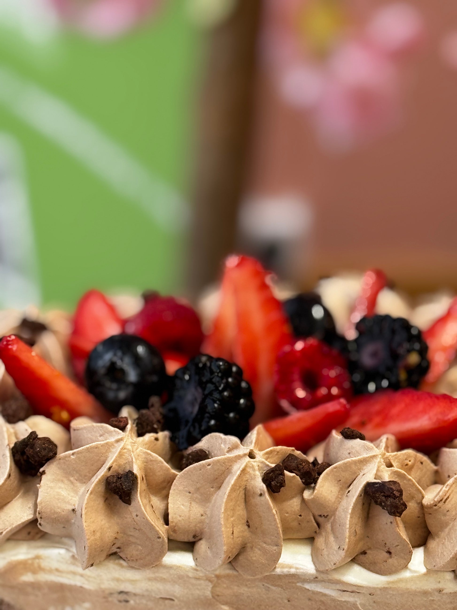 Para terminar, una cobertura vibrante de frutos rojos frescos que equilibran lo dulce con un toque ácido y frutal.